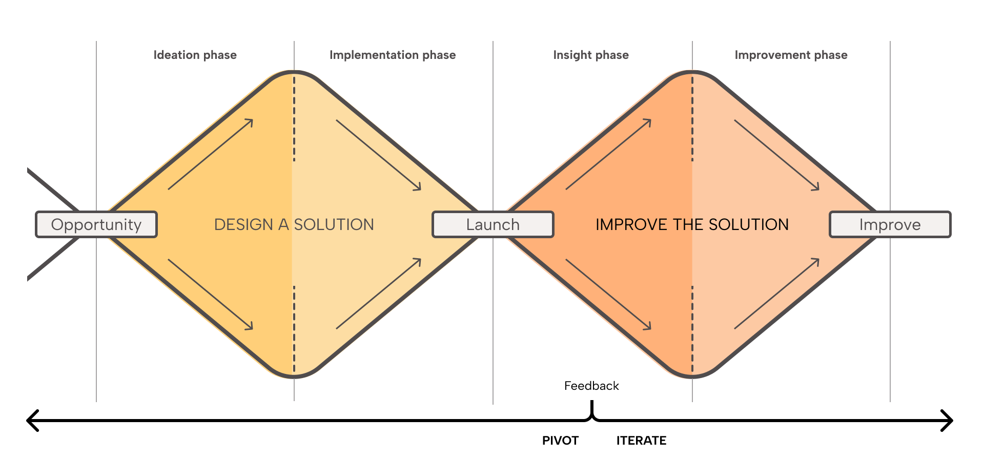 Instead of following an ideal design approach, in which you get insights before launching a product, the product is launched and gather insights from real customers. In this case, the ideation and insights phase worked as a way to have a better understanding of the problem, the users and the context.