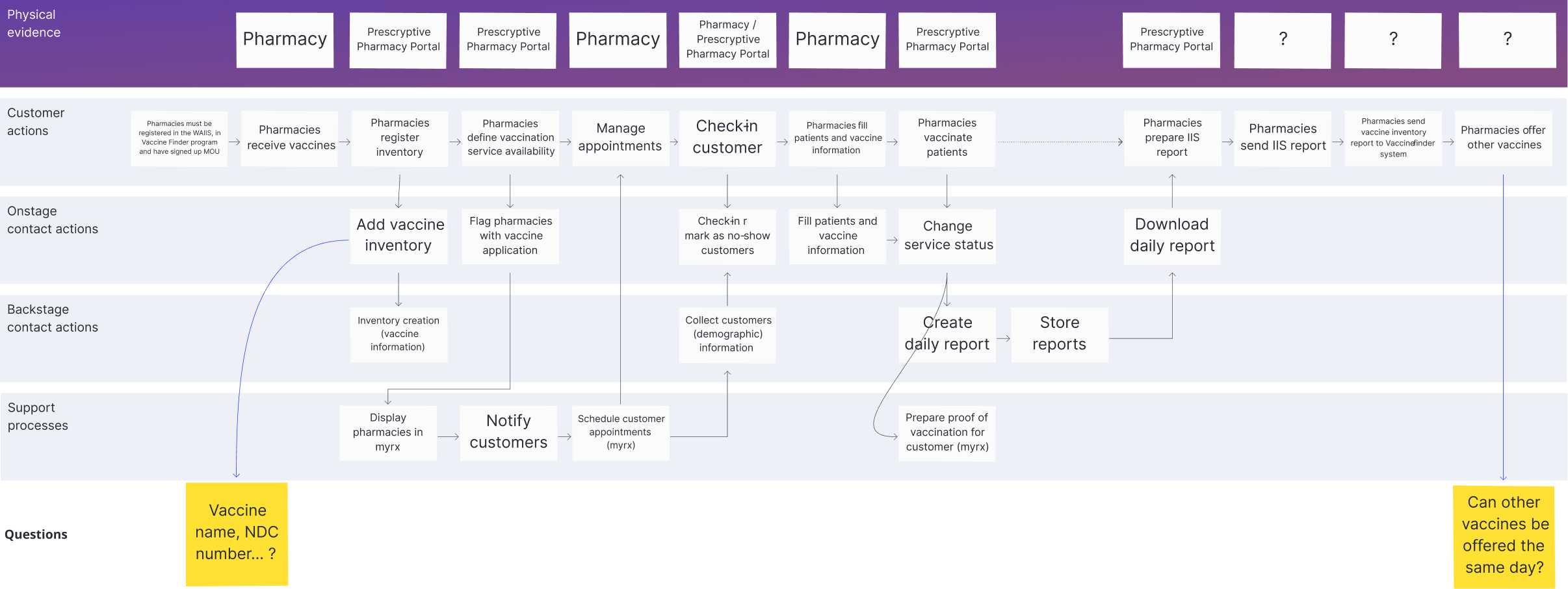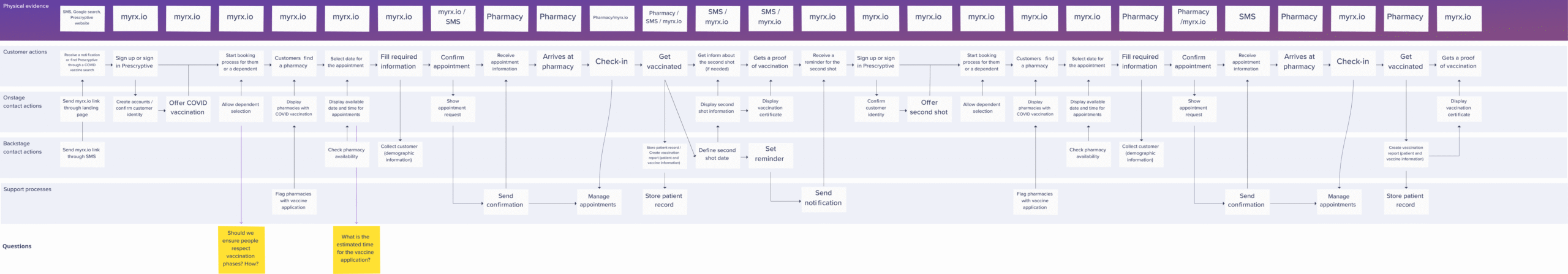 Conversations helped to discover other actors that were involved in the project. The Immunization Information system, PrepMod, VaccineFinder, Commercial insurances. This map needed modifications after the public launch. We didn’t considered States nor dependants in the first iteration.