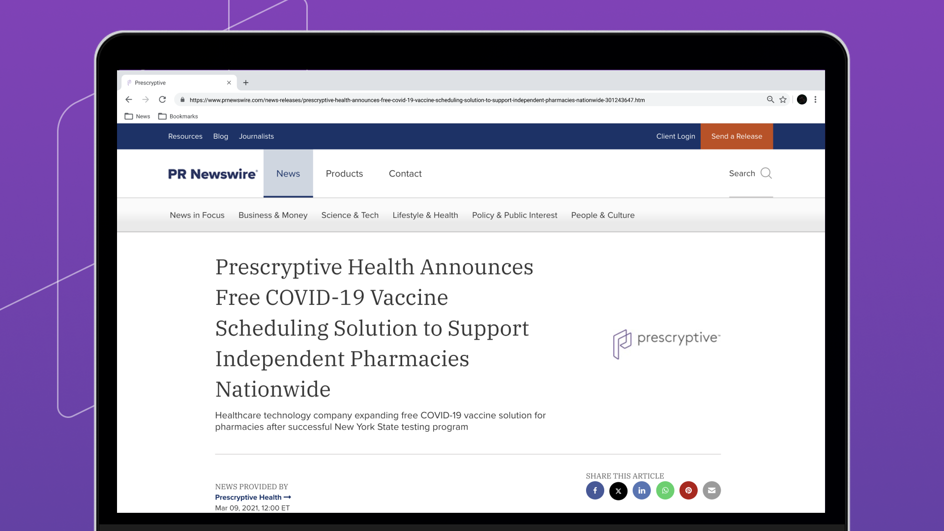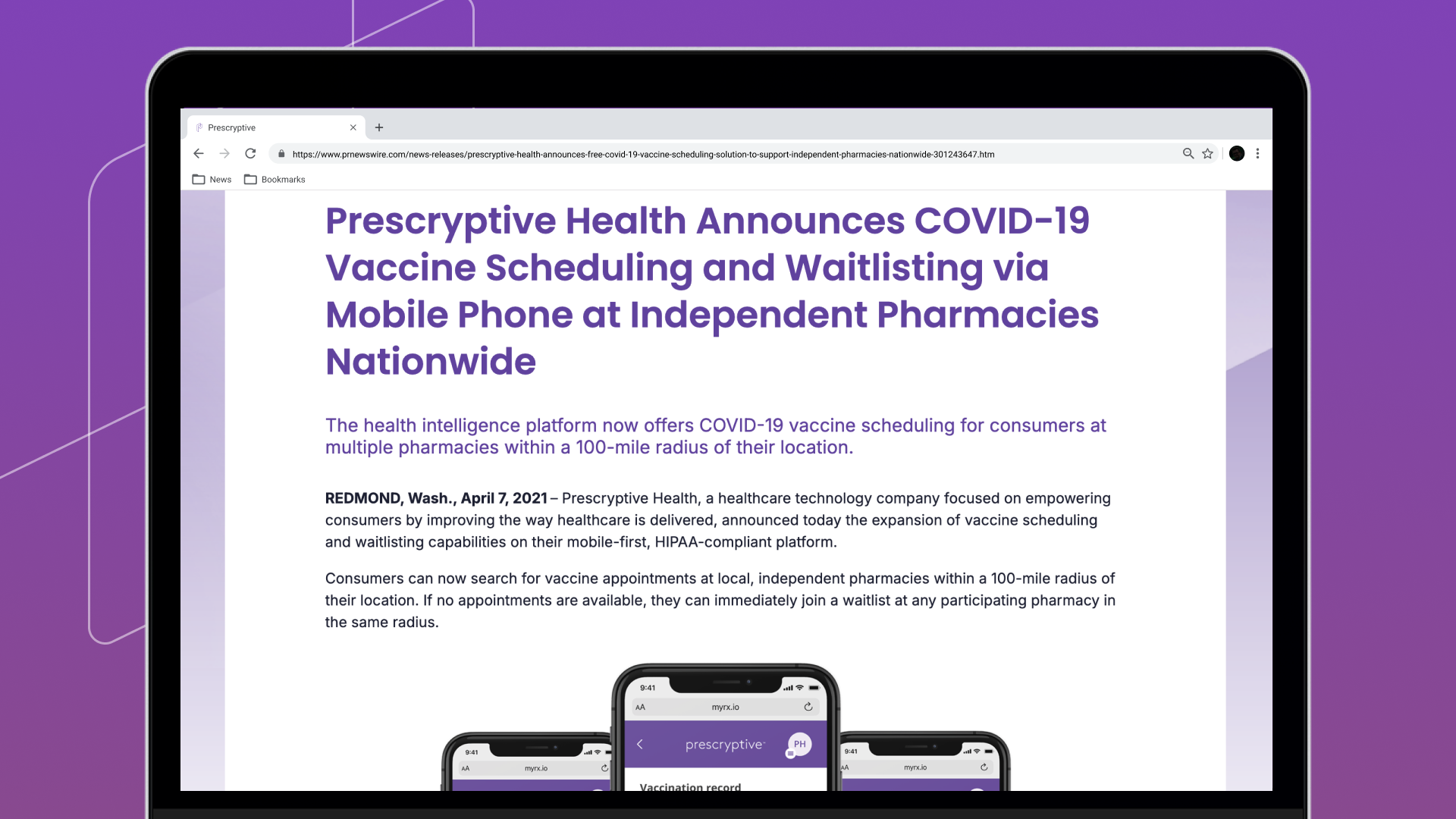 During the emergence of COVID-19, visiting healthcare facilities in person could expose healthy individuals to the virus. In response to this challenge, Prescryptive Health, a tech company founded in 2017, created an appointment platform facilitating the scheduling COVID-19 tests and vaccines for individuals through the US pharmacy community. It was publicly launched in December 2020 in the New York state.
