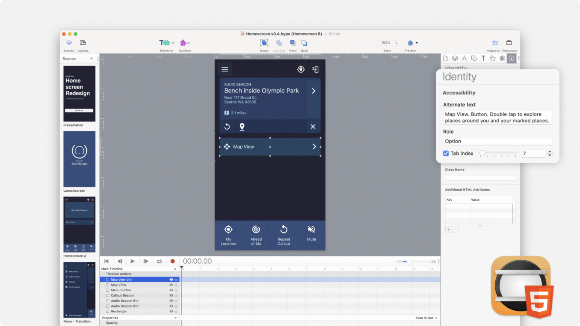 Prototyping tools are unable to work correctly with iOS VoiceOver, even nowadays. However, I knew HTML and ARIA properties could be an option since I created websites from scratch in the past. To symplify the process, I used tumult Hype 4.