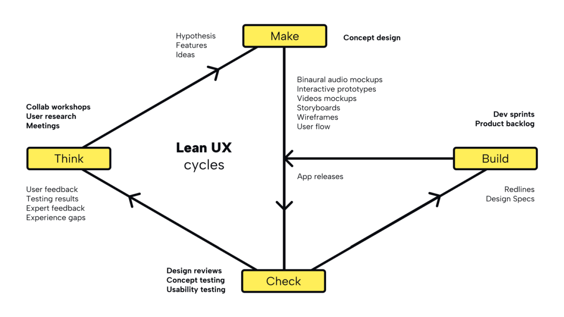 The design process followed a Lean UX design process. Different techniques and tools were used to transform ideas or hypothesis into concepts and features. Here are some examples.