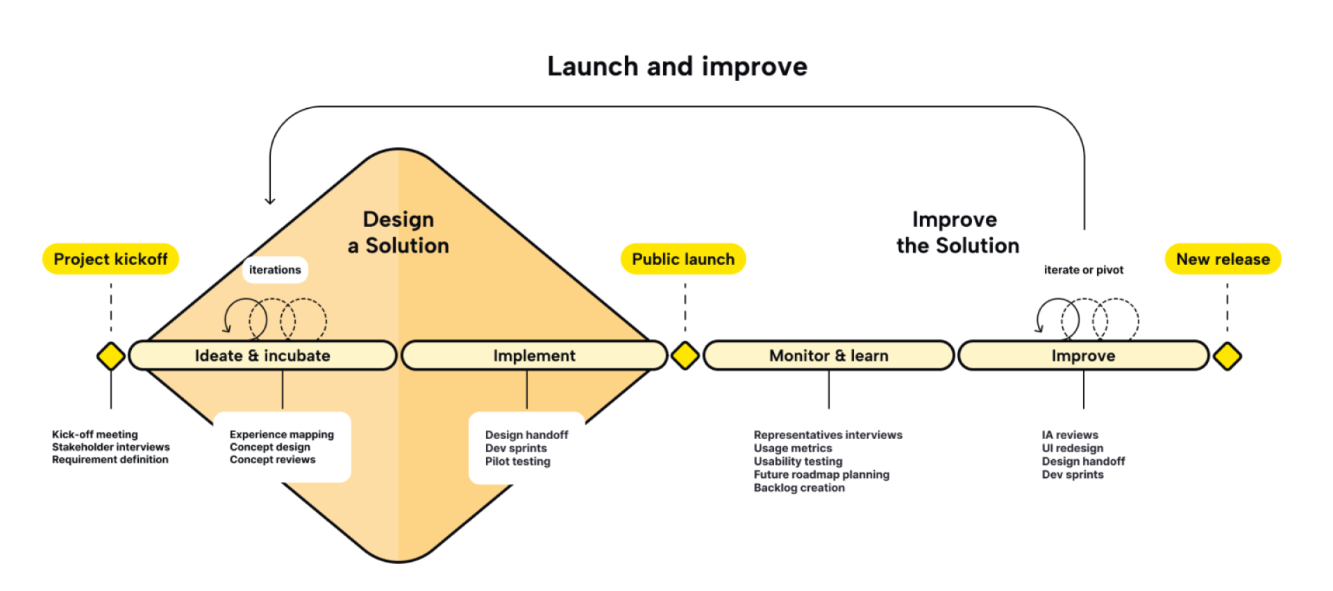 Instead of following an ideal design approach, in which you get insights before launching a product, the product is launched and gather insights from real customers. In this case, the ideation and insights phase worked as a way to have a better understanding of the problem, the users and the context.