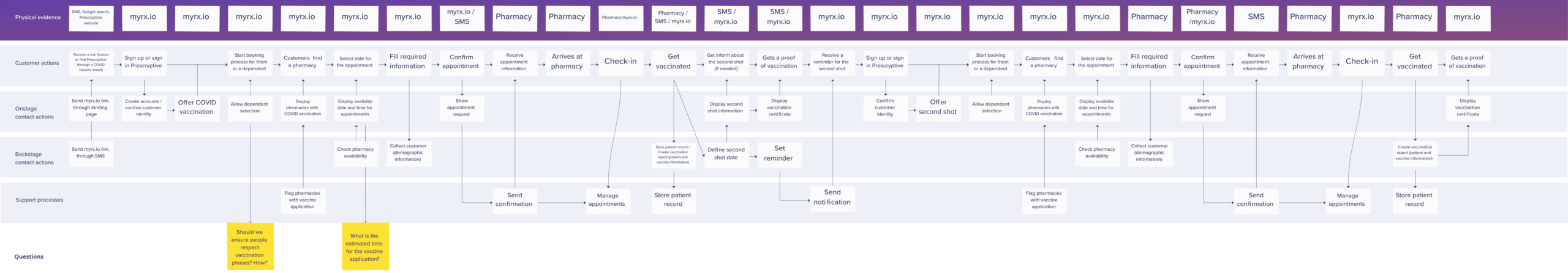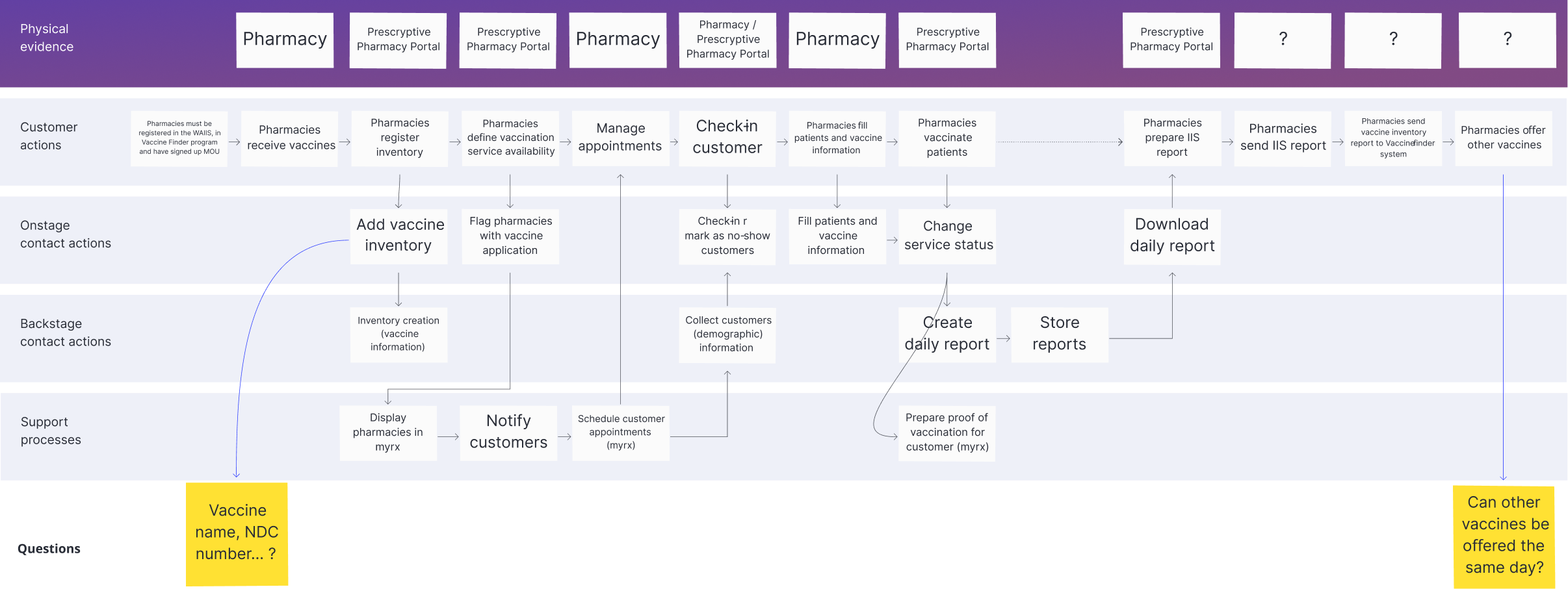 Conversations helped to discover other actors that were involved in the project. The Immunization Information system, PrepMod, VaccineFinder, Commercial insurances. This map needed modifications after the public launch. We didn’t considered States nor dependents in the first iteration.