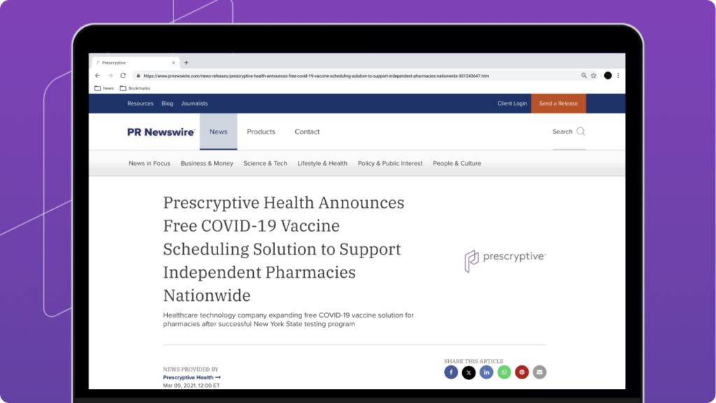 In December 2020, Prescryptive partnered with the New York State government to provide COVID-19 testing at no cost for its residents using the platform. A month later, vaccine appointments were included.